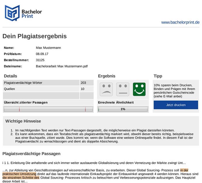 Als letztes wird bei der Plagiatsprüfung ein Plagiatsreport erstellt, den Du an die angegebene E-Mail-Adresse zugesendet bekommst. Im Plagiatsreport kannst Du dann das Ergebnis der Plagiatsprüfung einsehen und dementsprechend Korrekturen an Deiner Arbeit vornehmen. Schon 24 h nach der Online-Plagiatsprüfung werden Deine Daten vom Server gelöscht. Auch in einer Datenbank wird Deine Arbeit dabei nicht gespeichert. Deine Arbeit ist also bei der BachelorPrint Plagiatsprüfung sicher – ganz im Sinne des Datenschutzes.